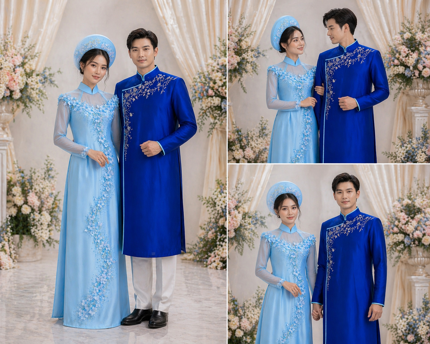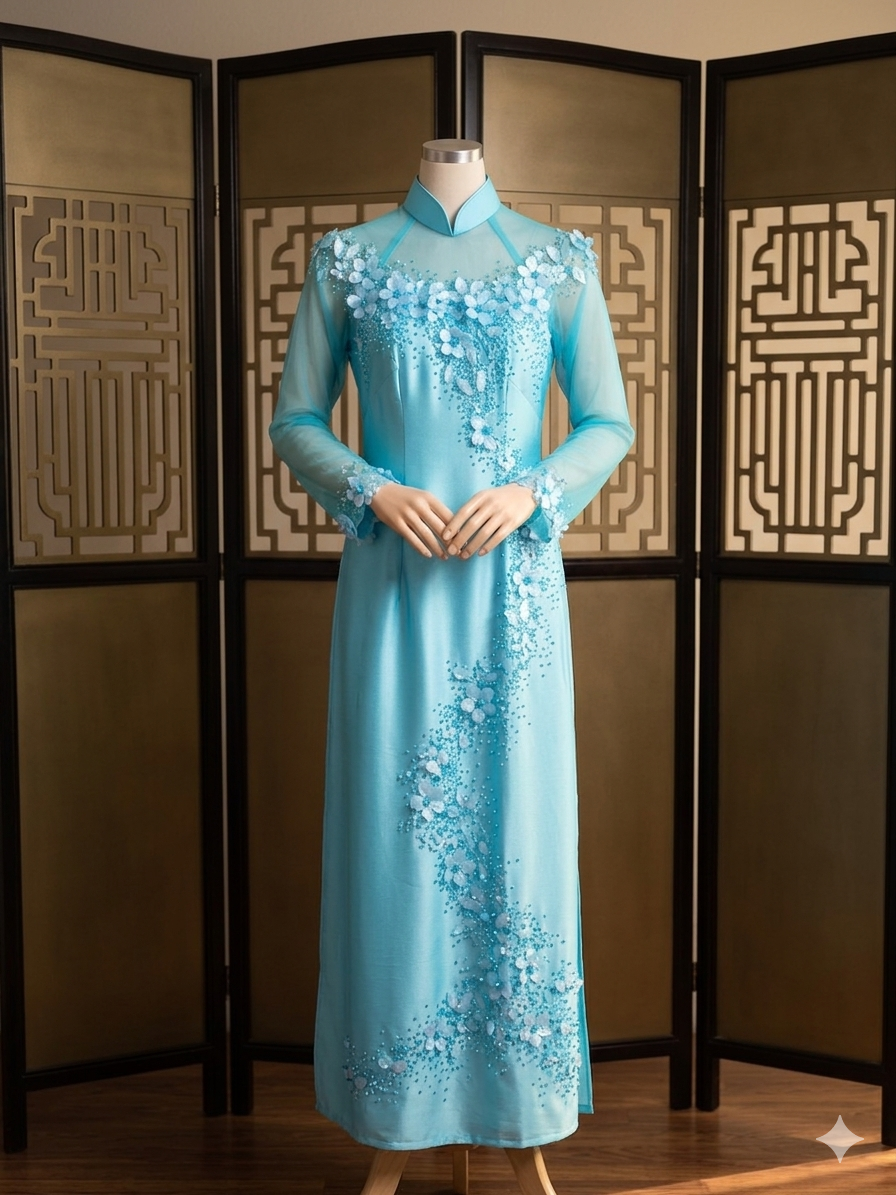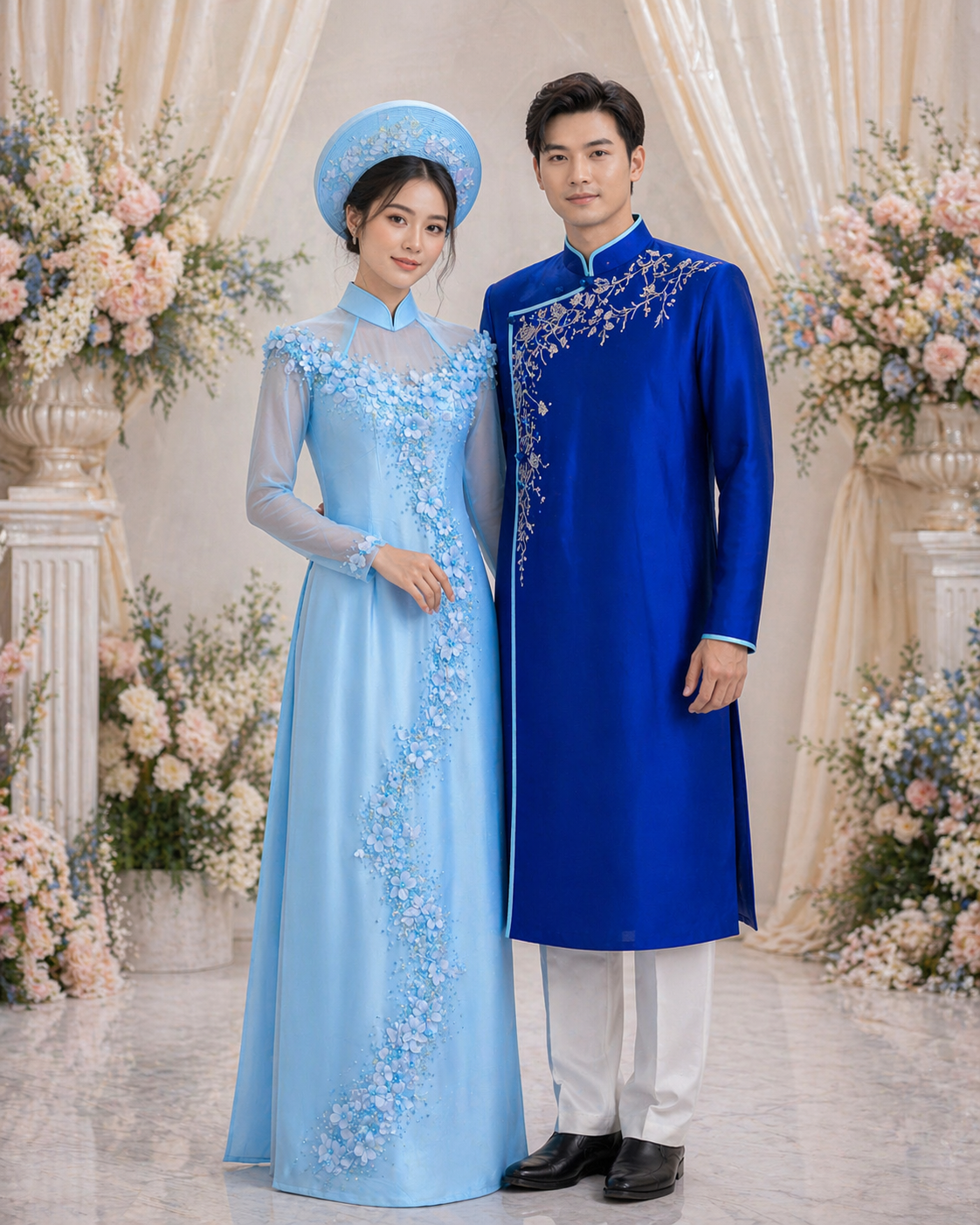 Elegant, serene, and beautifully balanced, the Celestial Blue Harmony Ao Dai couple set is a graceful expression of modern romance and refined tradition. The bride’s ao dai is crafted in a soft sky-blue tone, adorned with delicate floral appliqué that cascades organically along the silhouette, creating a light, airy sense of movement. Sheer sleeves and a structured neckline add a touch of contemporary elegance while maintaining timeless femininity.