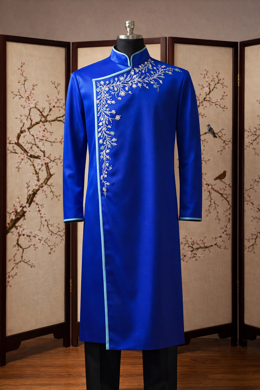 The groom’s ensemble contrasts beautifully in a deep royal blue, featuring refined embroidery that sweeps across the chest in a subtle, artistic composition. The clean tailoring enhances a strong, polished presence, perfectly complementing the bride’s softness.