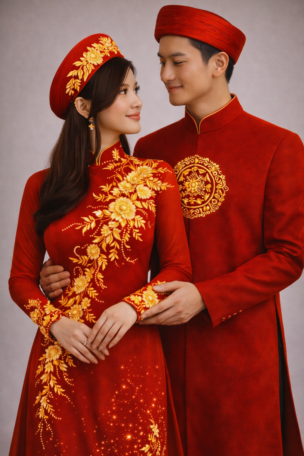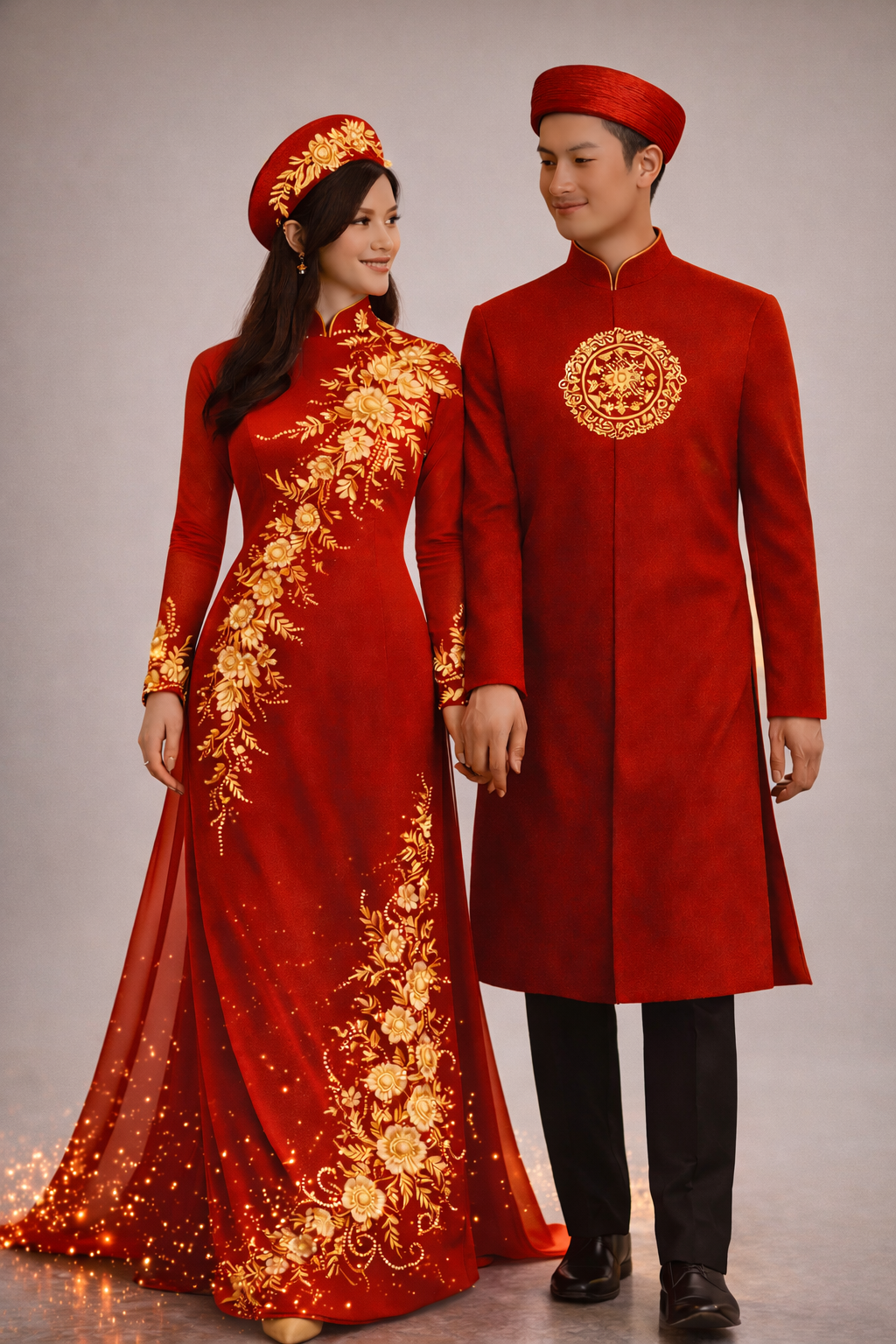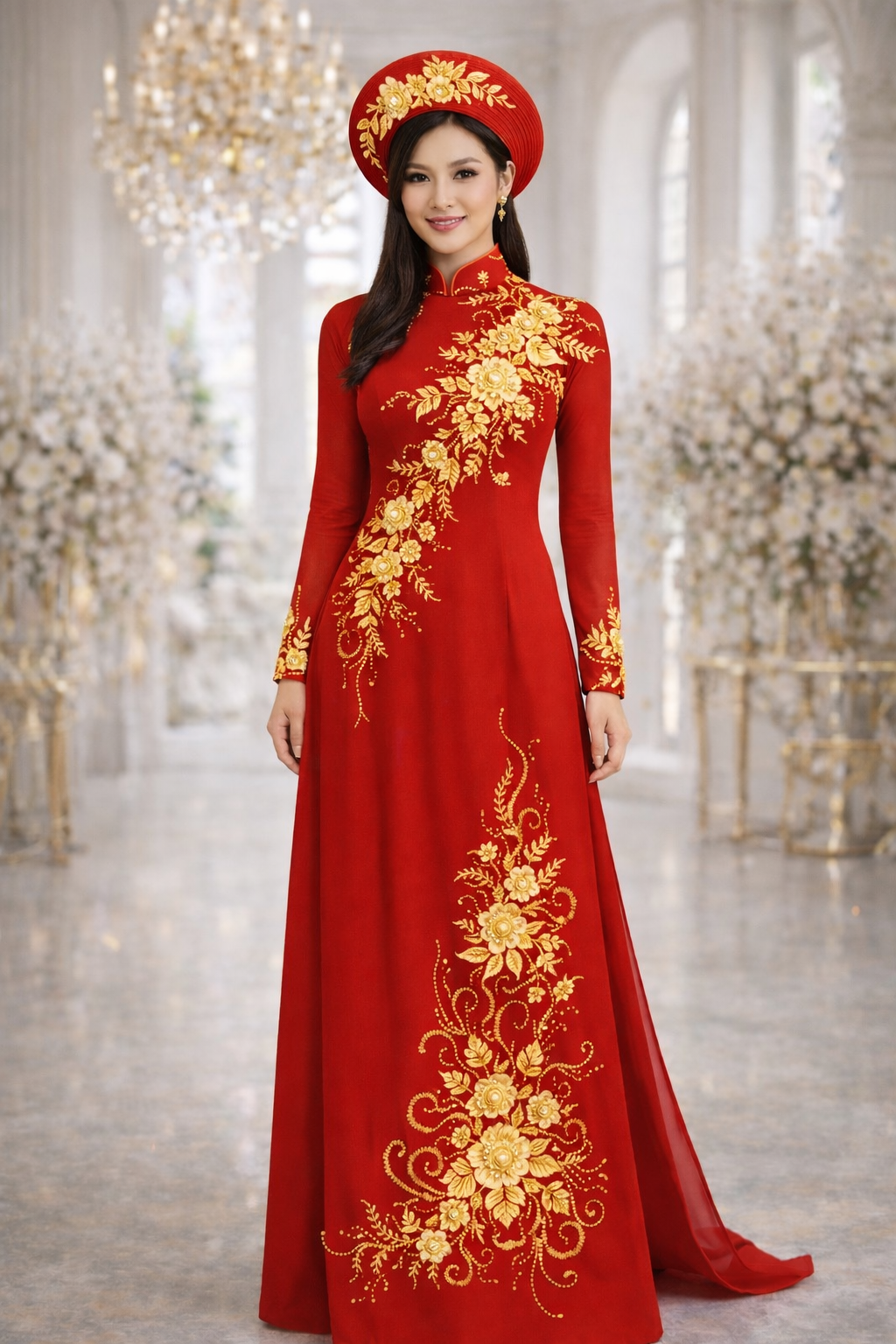 The bride’s ao dai is sculpted in a rich crimson tone, elevated with delicate lace floral appliqué layered over the fabric, creating depth, texture, and dimension. Each motif is carefully placed to flow along the silhouette, then enhanced with fine beadwork and hand-applied embellishments, adding a soft, radiant shimmer that moves with every step.